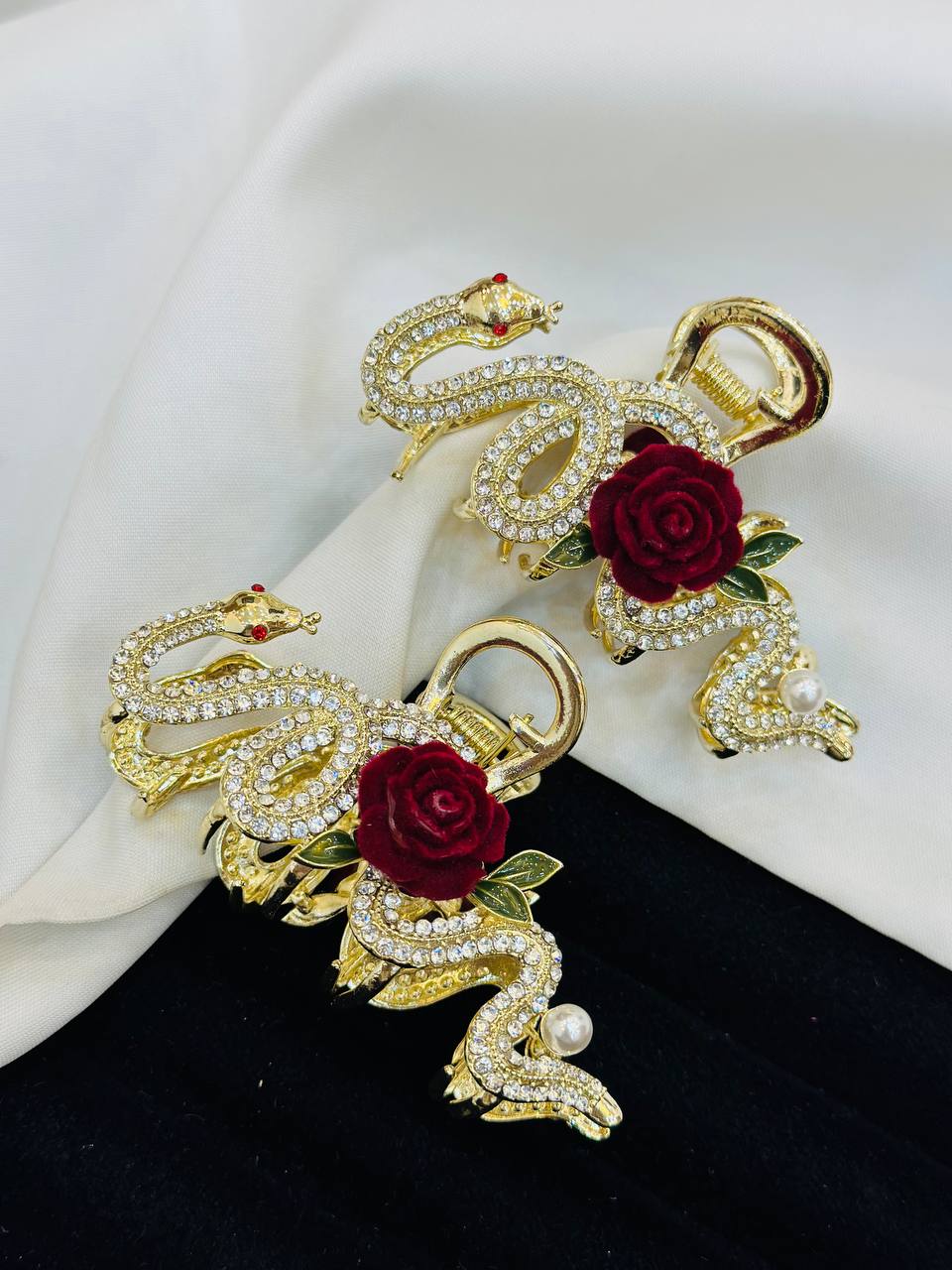این کلیپس ۸ سانتیمتر طول دارد ، کل رز و نگینهای شفاف بدن مار در کنار هم ترکیبی زیبا ساخته و روی موها زیبایی صد چندان ایجاد میکند. از محصولات جدید زایا که در حال حاضر در بازار بسیار نایاب است . این کلیپس با آبکاری و ساخت مقاوم سالها به موهای شما زیبایی خواهد بخشید.