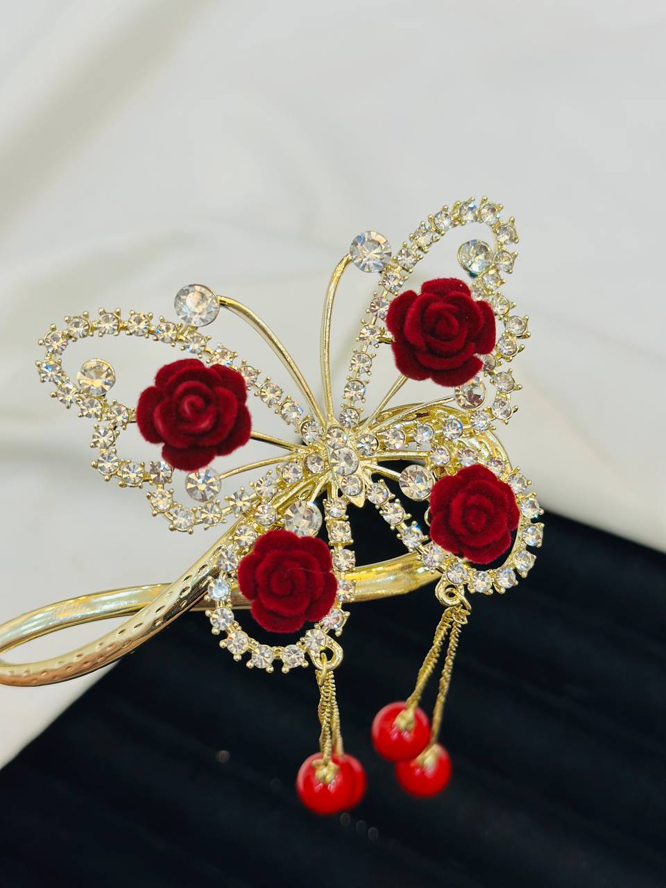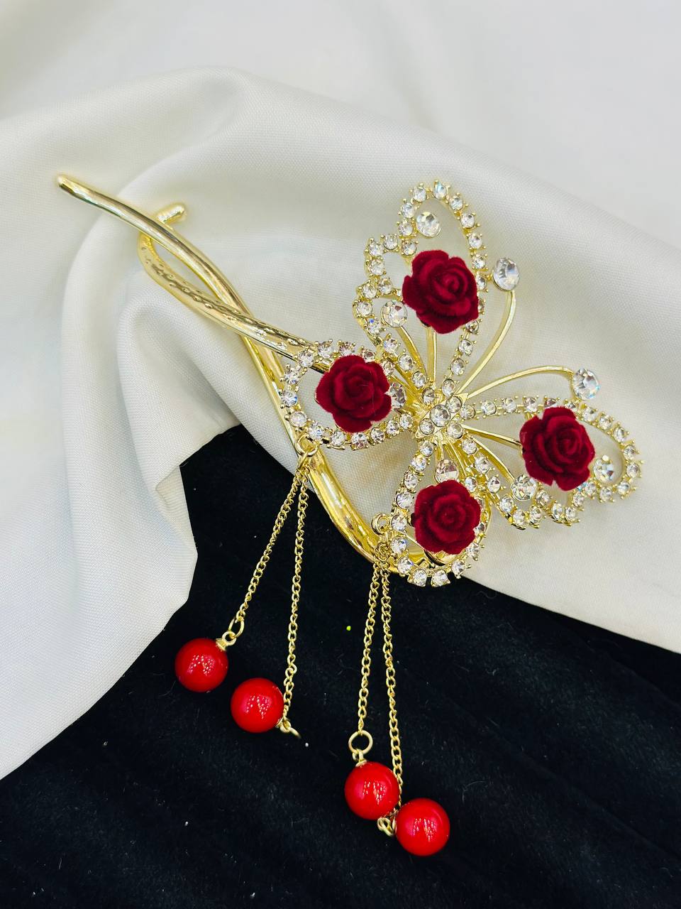 گیره چفتی محکم و زیبا مناسب مجالس ، میهمانیها، جشنها و بهترین هدیه برای شما و عزیزانتان. به طول ۱۲ سانتیمتر مناسب هر حجم مو با فنر قوی . به دلیل ترکیب رنگ طلایی و قرمز ، روی تمام رنگهای مو جلوه دارد.