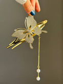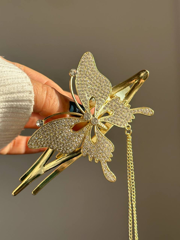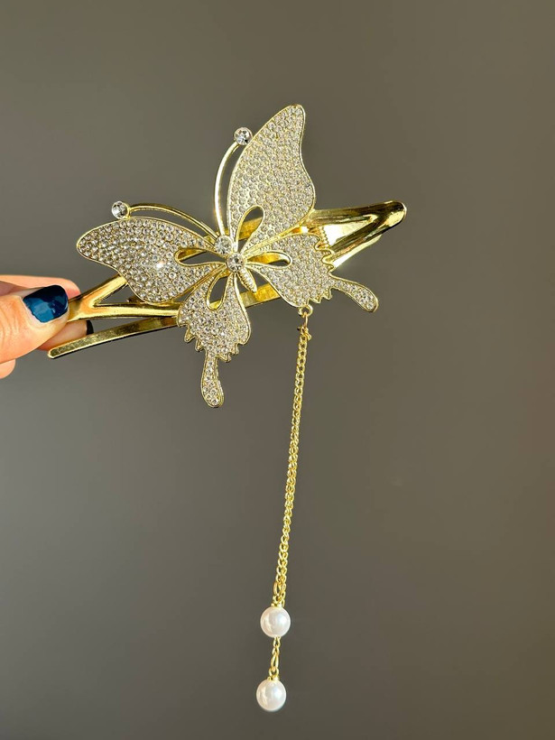 گیره انبری پروانه طلایی مناسب پشت مو و قابل نصب بر روی شینیون های ساده، با آبکاری طلایی و سنگهای درخشنده مخارج کاری شده به اندازه جواهر زیبایی دارد . از محصولات پر کار و ارزشمند برند زایا میباشد که بسیار کمیاب بوده و در نوع خود بی نظیر است.