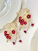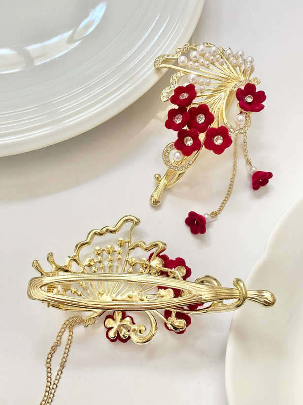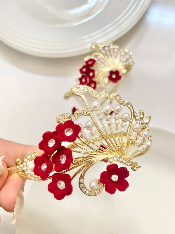 گیره چفتی پروانه و گل جواهری ، گیره ای با آبکاری بسیار با کیفیت ، گلهای مخملی زیبا و نگینهای شفاف و آویزهای ظریف و شیک ، تصویری بسیار گیرا و زیبا ایجاد کرده که با نصب روی موها جلوه ای حیرت انگیز خواهد داشت.