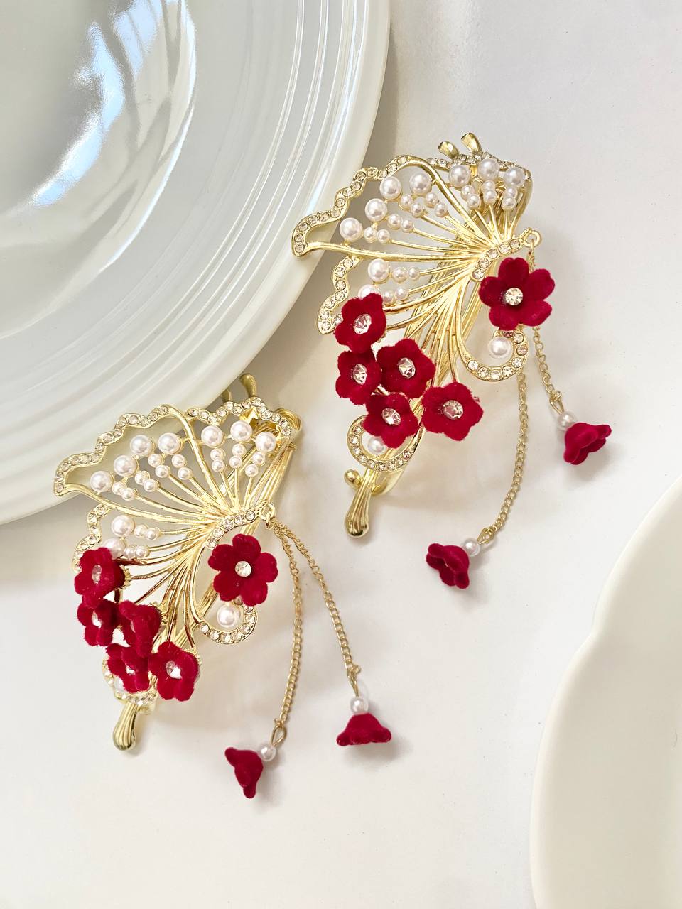 گیره چفتی پروانه و گل جواهری ، گیره ای با آبکاری بسیار با کیفیت ، گلهای مخملی زیبا و نگینهای شفاف و آویزهای ظریف و شیک ، تصویری بسیار گیرا و زیبا ایجاد کرده که با نصب روی موها جلوه ای حیرت انگیز خواهد داشت.